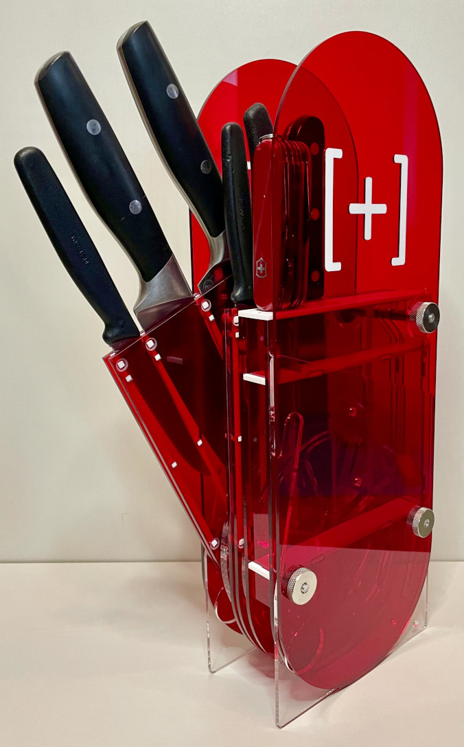 Dans sa version standard, le couteau suisse de cuisine est proposé avec des éléments rouges translucides.